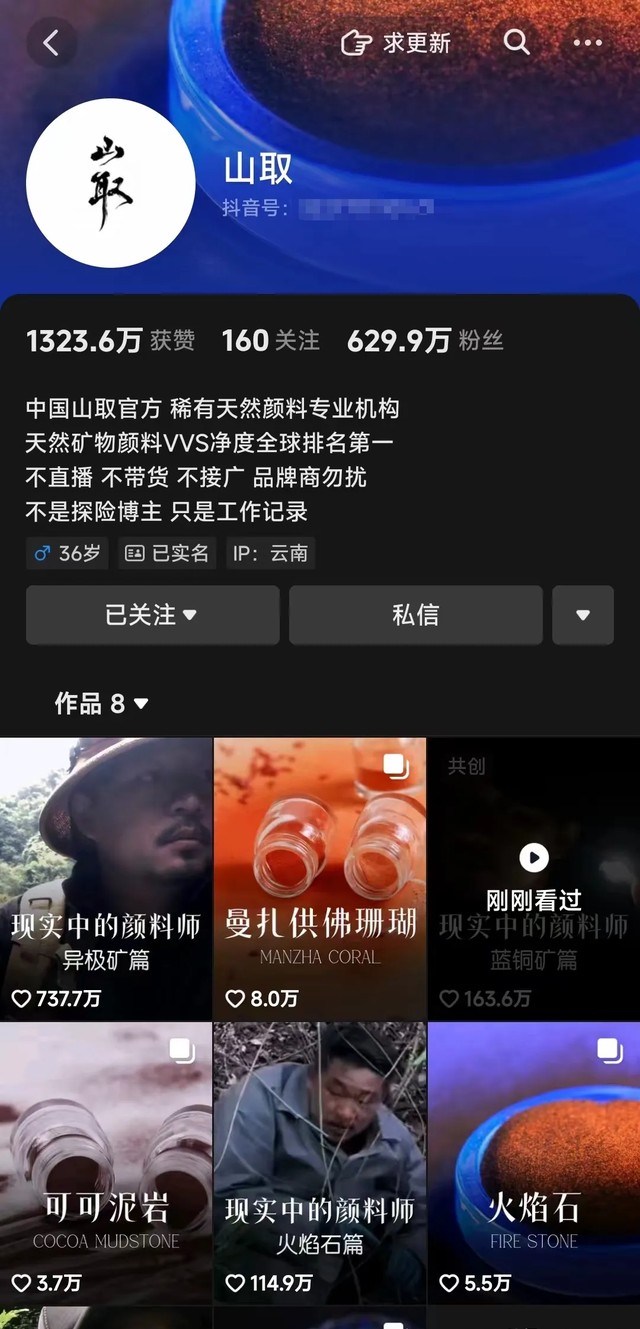 该抖音账号由“云南山取画材有限公司”运营,该公司主要经营业务有颜料制造、颜料销售等等。