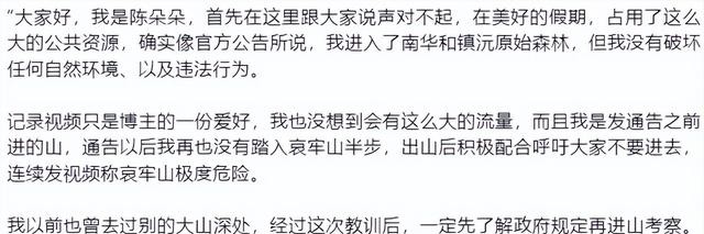 随后陈朵朵发文表示自己在进入哀牢山之前并不知道这个公告,但工作人员并不接受这个解释。