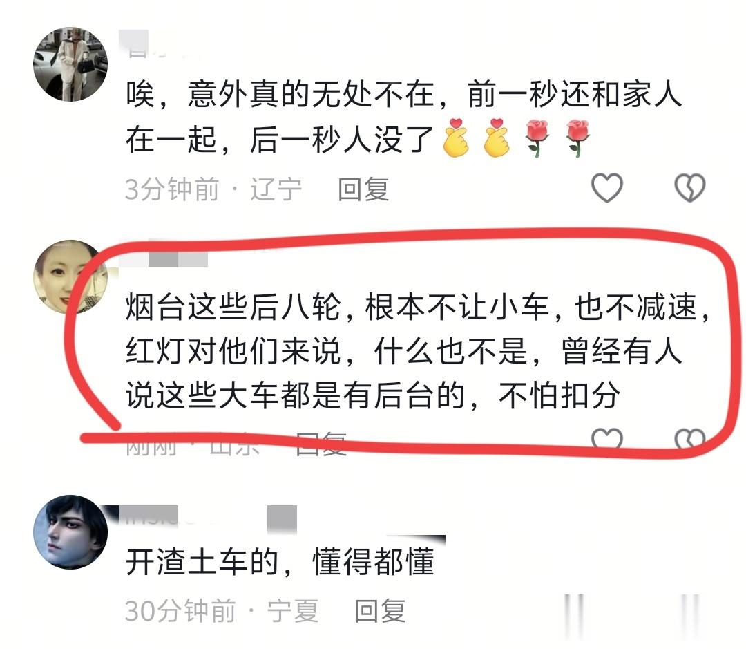 在评论区看到本地人称,烟台这些开后八轮的,根本就不懂减速,更不会礼让,红灯对他们来说跟没有一样。