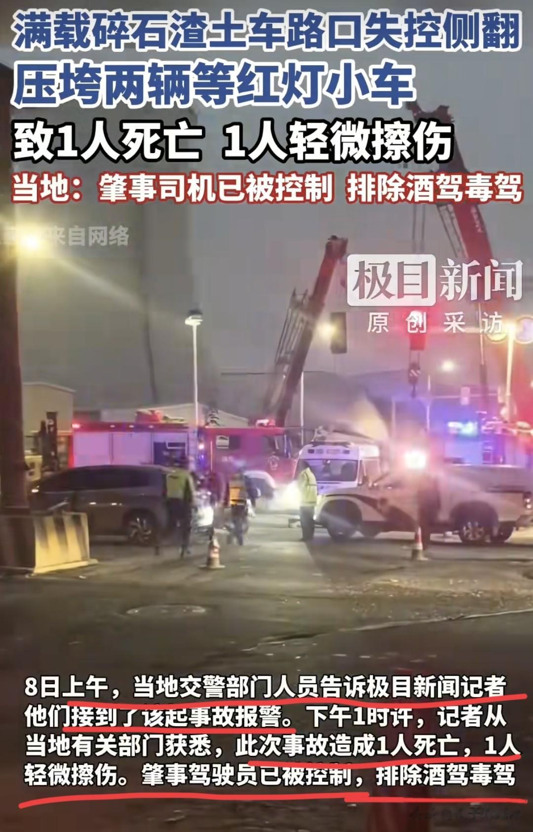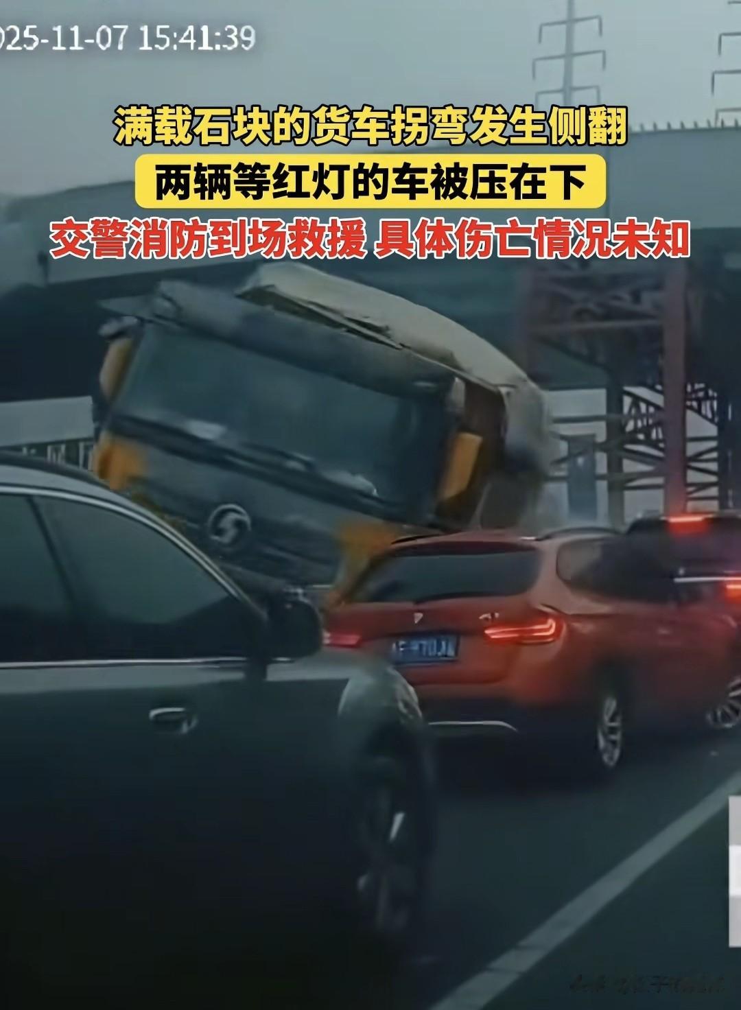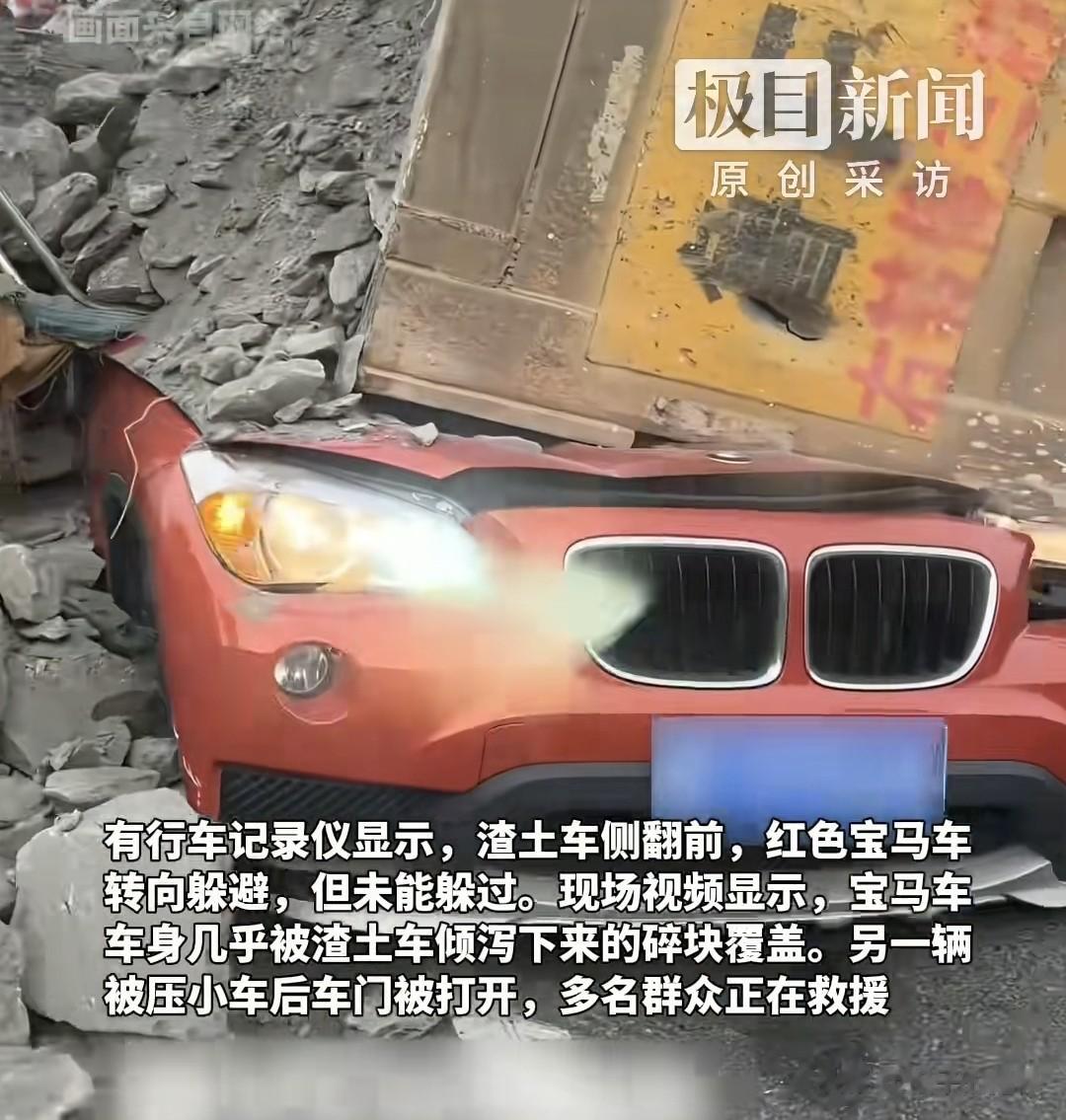 本来就一瞬间不走就是被侧翻渣土车压垮。
