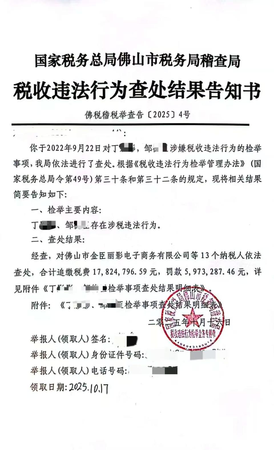 佛税稽税举查告[2025]4号税收违法行为查处结果告知书显示,对丁某某、邹某某(即小影夫妇)涉嫌税收违法行为的检举事项,我局依法进行了查处。经查,两人存在涉税违法行为,对佛山市金臣丽影电子商务有限公司等13个纳税人依法查处,合计追缴税费17824796.59元,罚款5973287.46元。