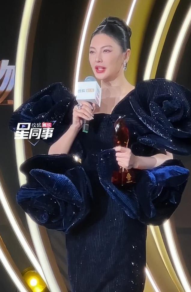 而在内场,她换上了一套深蓝色立体玫瑰花礼服,优雅大气,将好身材包裹得严严实实,却依旧散发着迷人的魅力。