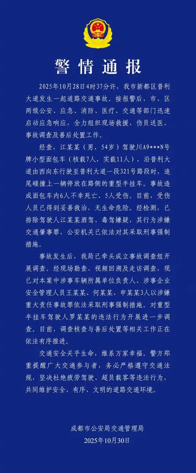 据成都交警部门发布的警情通报,10月28日(星期二)清晨4时37分许,一辆载有11人的面包车(核载7人),行驶在新都区普利大道321号路段时,追尾碰撞停在路边的重型半挂车,造成6人当场死亡、5人不同程度受伤被送医的事故。