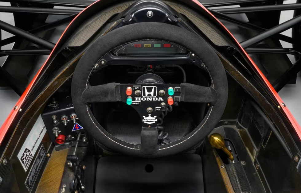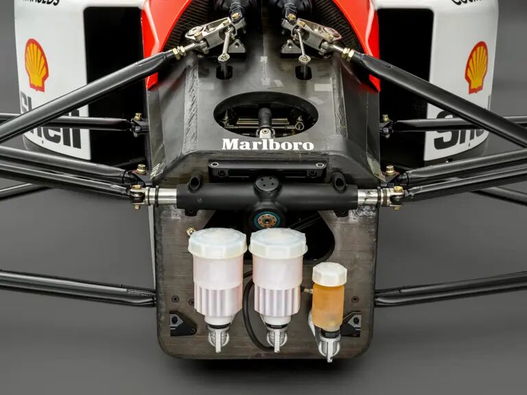 对比如今迈凯伦MCL39等现代F1赛车的多功能数字化方向盘,MP4/6的方向盘设计简洁纯粹,仅保留核心操控部件,直观展现了那个依赖车手驾驶技术而非电子辅助的黄金时代特质。