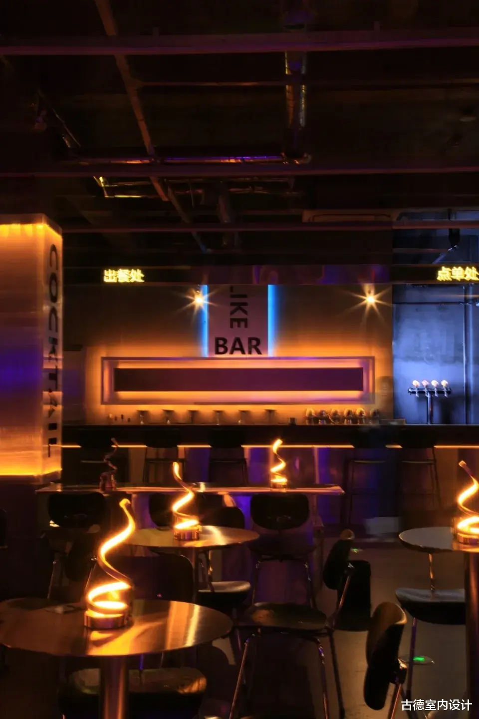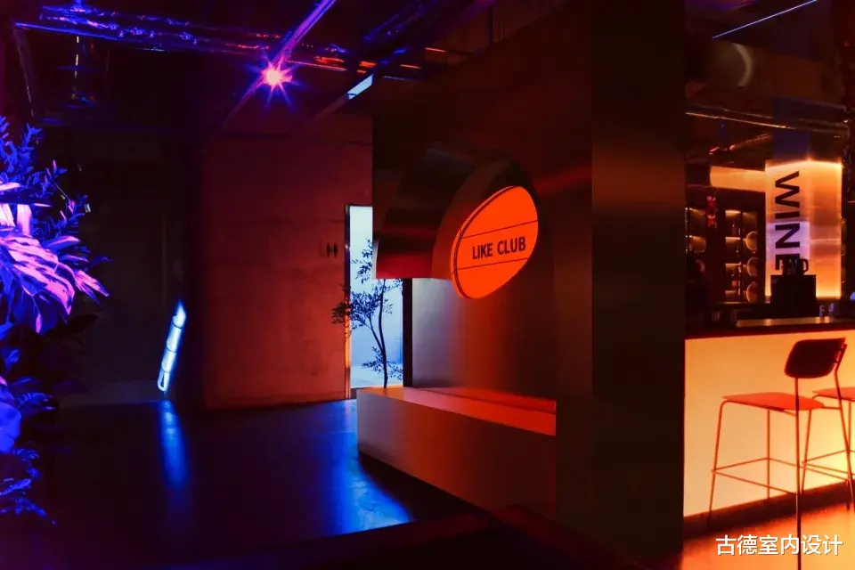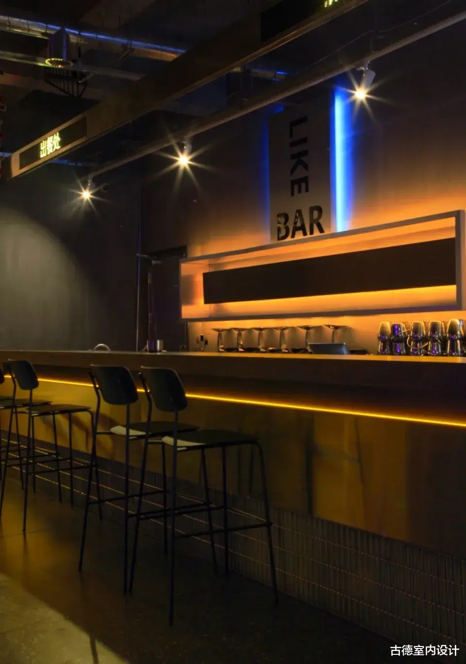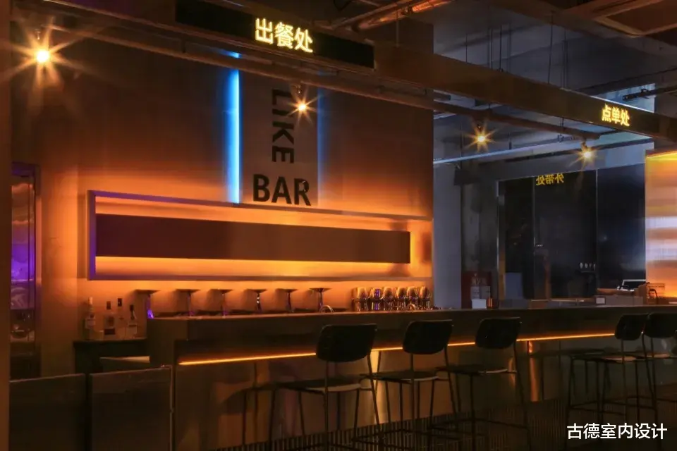 ▲一楼灯具和音响细节© 陈灏舟、冼科吉有意义的生活,也需要无意义的调剂设计团队从业主的角度去考虑经济问题,我们在策划阶段在一楼临街面设置了外摆区和外送区,并且建议业主在一楼的定价应该与二楼区分开来,一楼主要以聚人气和性价比消费为主。在通过角落里的楼梯来到二楼之后,绝对纯粹的酒吧场景才在顾客的眼前真正的展开——当夜幕降临,只有灯光可以照亮和重塑空间,二楼是LIKE BAR的高消费场所,拉丝铝板装置上赫然亮着橙红色的LIKE CLUB的灯箱,旁边装满威士忌的酒柜也凸显着这里的不同。