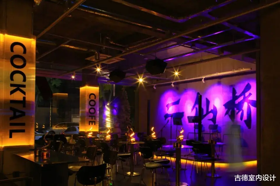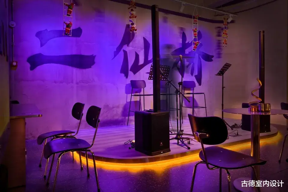 ▲一楼舞台© 陈灏舟、冼科吉这些矛盾美学既通过以上材料之间的冲突来表达,也通过室内空间冷暖色调的冲突来形成独特的视觉张力。亲切的暖色调呼应着烟火与市井气,契合着二仙桥的社群特点,冷色调的清冷则与潮流、科技、时尚相匹配。橙红色的暖色光源充盈在吧台、壁龛、酒桌与混凝土柱上,蓝色的冷光穿插在角落,冷暖相交的地方恰好是一楼舞台处,我们巧妙使用了红色和蓝色混合而成的紫色作为舞台的灯光,既彰显个性,又不失优雅。而这样的冲突贯穿于我们的项目之始终。