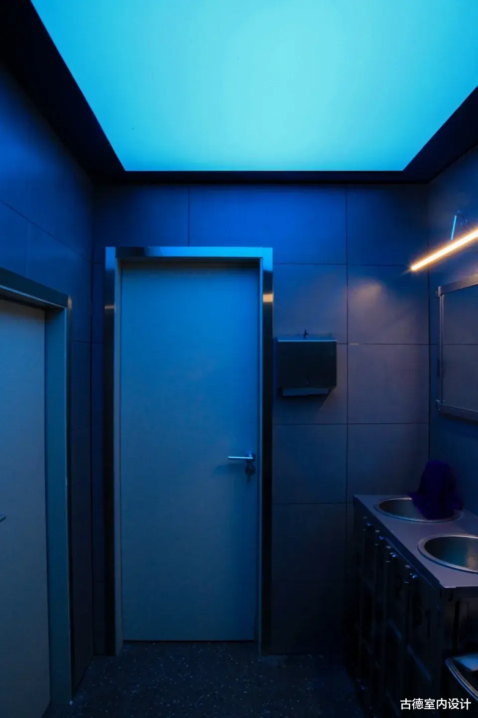 ▲二楼打卡区细节© 陈灏舟、冼科吉这里以U型的吧台作为平面的中心,包房等房间以及众多卡座都围绕它一一展开,每个地方都处在环形吧台的辐射范围内,这里相对安静,是朋友聚会畅谈抑或是享受酒精带来的麻醉的好去处。灯光膜让光成为一种弥散介质,金属表面的拉丝质感模糊了反射的光线,也模糊了真实空间,类似酒精的致幻作用,带来感官放松和快感。此时,空间仿佛失去了物理深度,去往纯粹且抽象的精神世界,这即是抽离的空间。