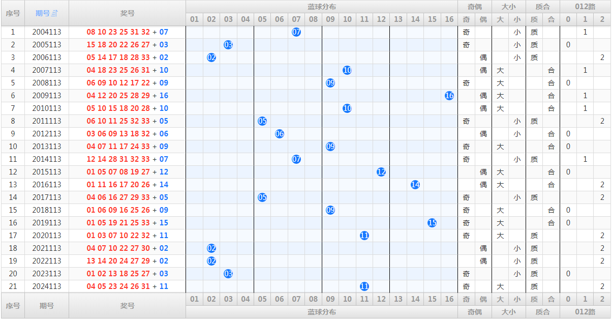 七、历史同期,蓝球开奖号码和走势图(历史数据演示):