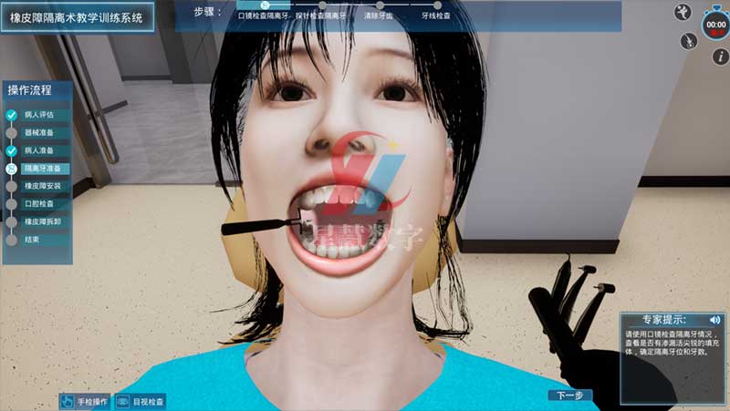 虚拟仿真技术带来的教学变革星慧数字推出的口腔数字化虚拟仿真平台为橡皮障隔离术教学提供了全新解决方案。这一平台利用先进的VR虚拟仿真技术构建高度仿真的实验场景,使学习者能够沉浸于虚拟操作环境中。可结合AR/VR/MR等设备,通过视听多感官刺激,学生可以反复练习橡皮障的放置、支架调整和夹子固定等关键步骤,而无需担心材料浪费或患者不适。