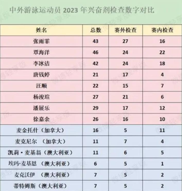 比赛前,中国游泳队经历了大量的兴奋剂检测,去年一年就接受了不下百次的检测,总次数高达256次,张雨霏和覃海洋的检测次数最多。