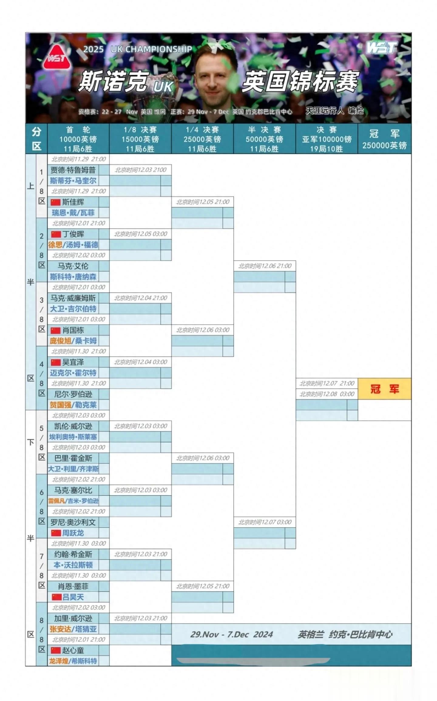 斯诺克英锦赛正赛签位揭晓,16场资格赛决胜轮比赛全部结束,中国选手9人参赛:吕昊天、周跃龙、庞俊旭、龙泽煌、张安达、雷佩凡、徐思七人晋级,袁思俊、贺国强两人出局!上半区,丁俊晖、斯佳辉、肖国栋、吴宜泽四位种子选手扎堆,徐思、庞俊旭两人入围,有希望创造惊喜!1、贾德·特鲁姆普vs斯蒂芬·马奎尔;