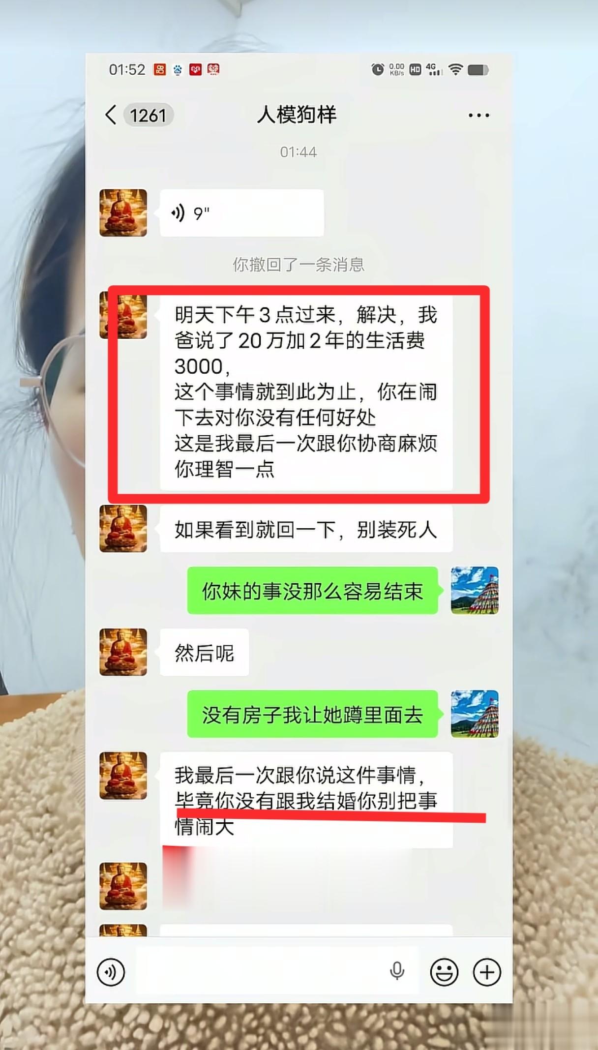 “我是看在孩子的份上给你20万还有生活费”,“毕竟我们没有领结婚证,你没有跟我结婚你别把事情闹大。”