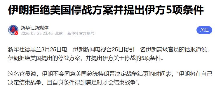 3月25日,伊朗正式拒绝了特朗普提出的停火方案。 这份方案据美媒报道是通过巴基斯坦转交的,核心要求是伊朗承诺永不发展核武器并拆除现有核设施。对于这个方案,伊朗外长阿拉格齐的回应可以说毫不客气:"我们不要停火,我们要的是在自己的条件下彻底结束战争。"