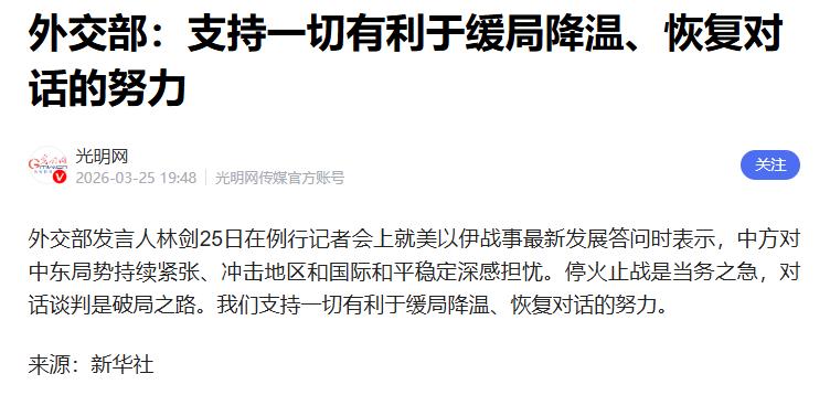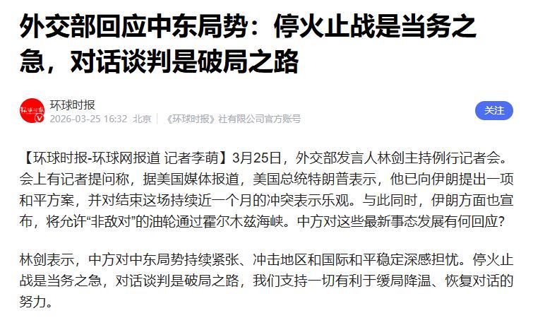 3月25日的外交部例行记者会上,发言人林剑回答了多个与伊朗局势相关的问题。 法新社记者问到特朗普的"和平方案"被拒一事,林剑的回答简洁有力:"停火止战是当务之急,对话谈判是破局之路。我们支持一切有利于缓局降温、恢复对话的努力。"