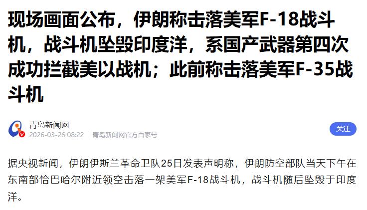 F-18疑云与伊朗的五个条件3月25日这一天,全球社交媒体几乎被同一段视频刷屏。伊朗革命卫队第一时间发表声明,宣称这是其海军防空力量使用国产防空系统,在东南部恰巴哈尔上空精准命中的一架美军F/A-18"大黄蜂"战斗机。声明特别强调,这架战机被击中后坠入印度洋,这是开战以来伊朗第四次声称拦截美以战机。