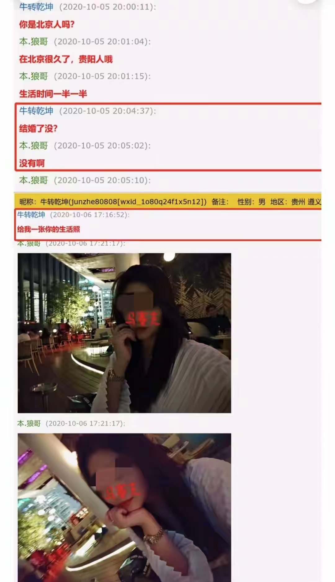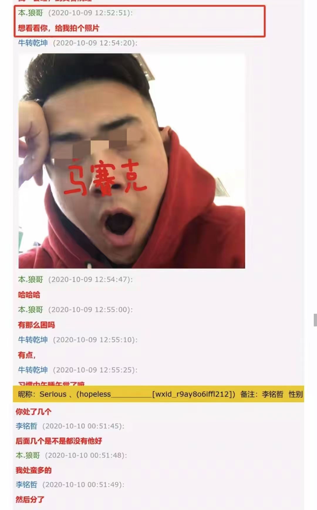 “狼哥”就是史林子,这位叫“扭转乾坤”的则是游泳教练。两人2020年在网上撩骚,时间日期显示聊的非常紧密,白天到深夜都有在聊,两人互相发照片,聊了四天就约了见面。