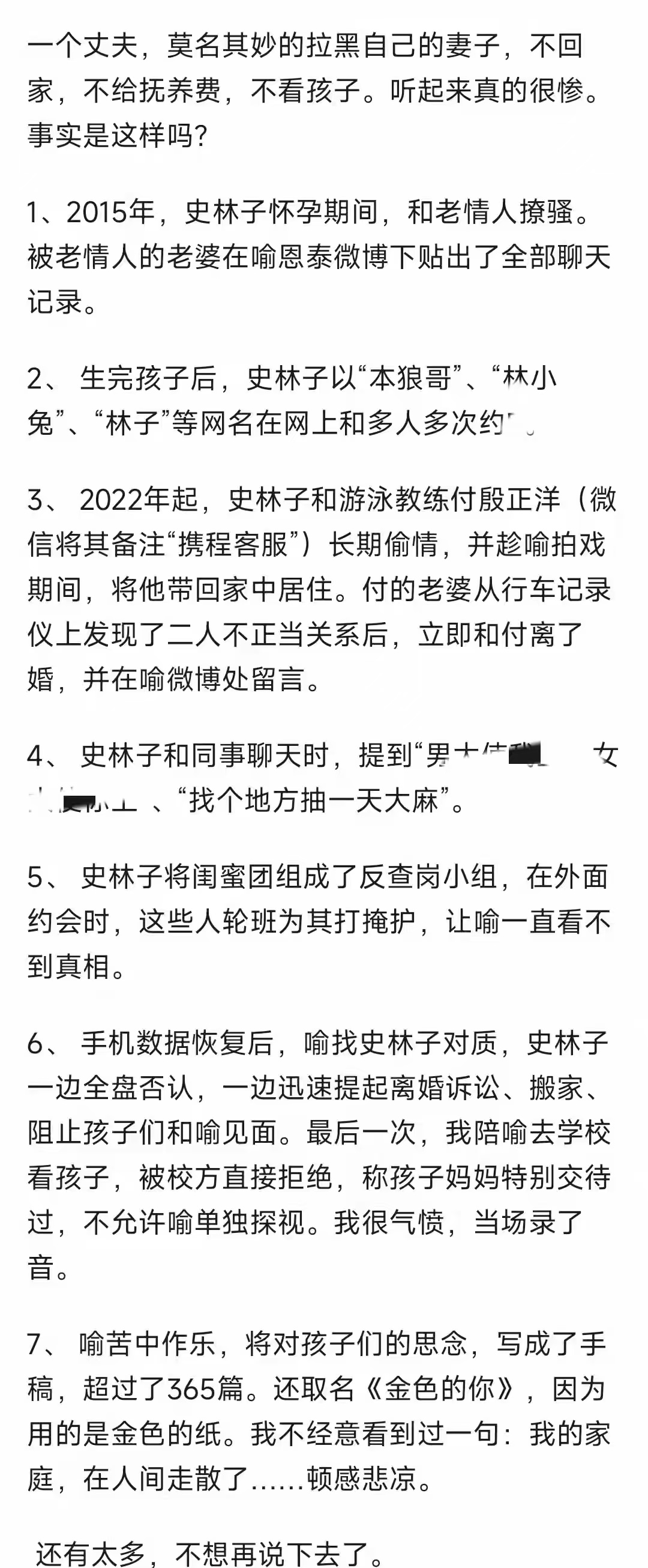 该好友列出了七大史林子出轨证据,第一条就已经足够炸裂!喻恩泰和史林子是2015年结婚的,没想到新婚第一年史林子在孕期就已经出轨,对象还是她的老情人!等史林子生完孩子后,她又在网上用三个账号跟网友撩骚约开房,一直到2022年史林子跟一名游泳教练长期偷情,被对方老婆发现并到喻恩泰微博“提醒”他,喻恩泰才有所察觉。直到揭发史林子出轨的是她的手机数据被恢复,这才让喻恩泰终于心死。该朋友称史林子出轨被证实后,把孩子藏起来不让喻恩泰探望,还让闺蜜团帮忙打掩护不给喻恩泰捉到自己的出轨证据。
