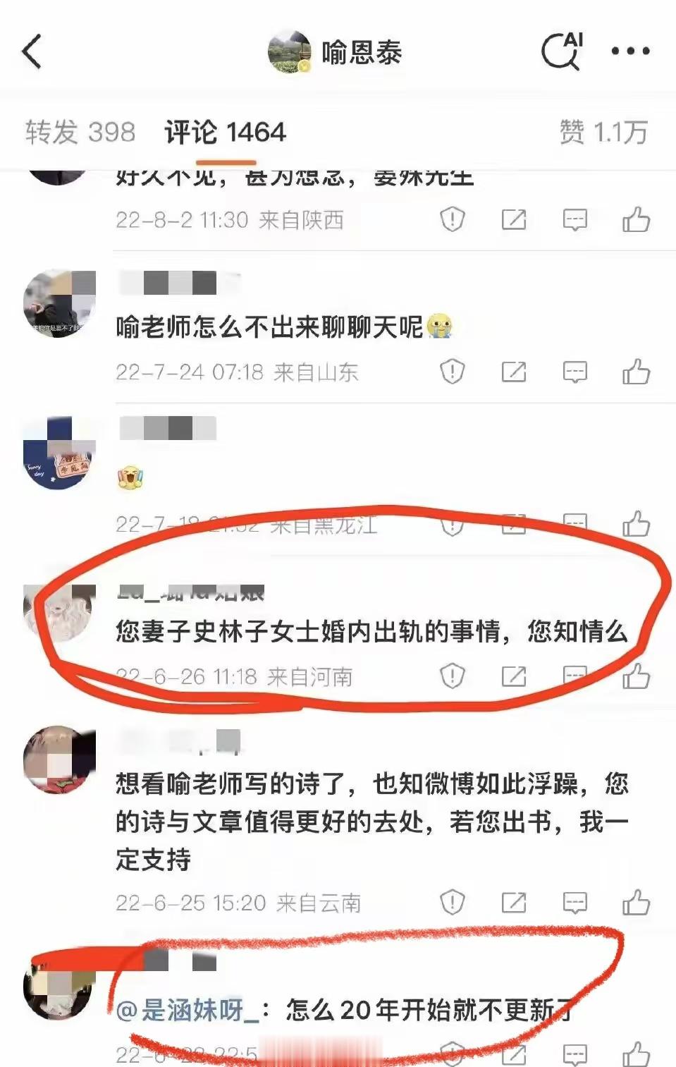 在2022年喻恩泰发了一条微博,史林子出轨对象的老婆还在他的评论区留言,问他知不知道自己的老婆婚内出轨。这对喻恩泰来说非常丢脸,尤其是在自己的评论区被人公开质问,当着那么多粉丝的面。可能喻恩泰在2020年就已经有所察觉了,底下有一位粉丝说喻恩泰从2020年开始就不怎么更新微博。