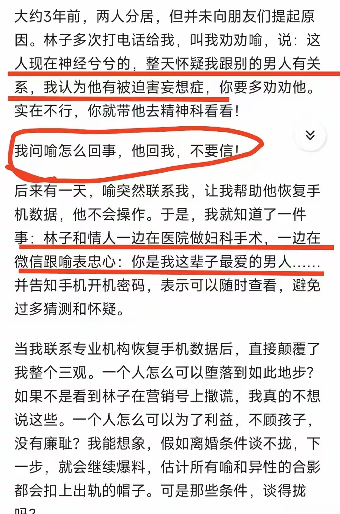 从疫情期间就开始感情破裂,喻恩泰开始和史林子分居。分居前后史林子还打电话给这位共同好友,让他帮忙劝劝喻恩泰不要总是疑神疑鬼怀疑她。据这位共同好友说,当时他帮忙恢复手机数据时,看到史林子出轨的聊天内容简直颠覆了他三观。一边和情人在医院做妇科手术,一边在手机上对喻恩泰表忠心。如今走到离婚第二次开庭,爆料者说他们还没有谈拢,也许史林子还会继续爆料抹黑喻恩泰。