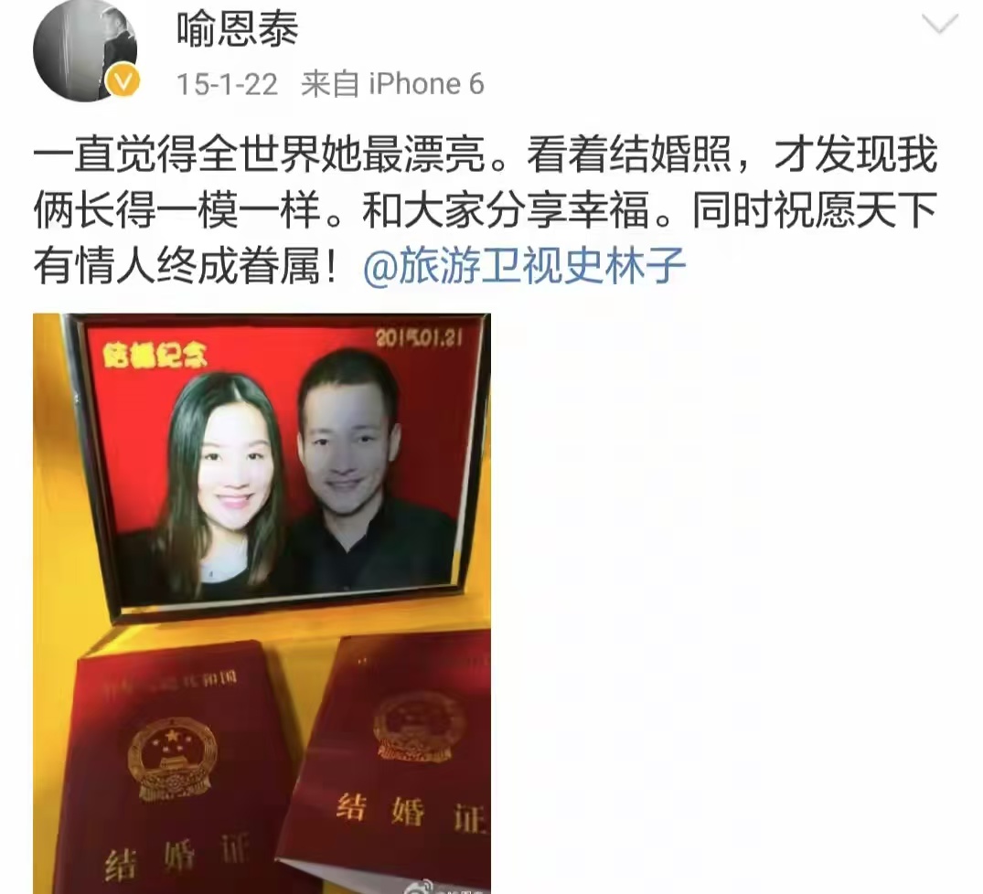 两人2015年结婚,结婚当天喻恩泰非常开心的跟大家宣布喜讯。原本他是不婚主义者,却对史林子一见钟情。婚后也努力养家,生了一双儿女,原本是很幸福美满的家庭,没想到十年不到却落到这样的结局。