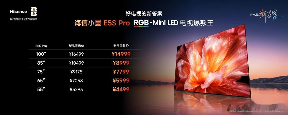 4月22日,海信举行了主题为“好电视的新答案”2026海信电视小墨E5系列新品发布会,正式推出全新一代产品——RGB-Mini LED电视爆款王小墨E5S Pro,以及Mini LED电视口碑王小墨E5S。作为2025年全网销冠的全新进化之作,小墨E5S Pro以革命性的RGB-Mini LED显示技术普及为核心,带来原生色彩、舒适视觉、绿色节能全方位跨代体验;小墨E5S则将过往Pro级的满血配置全面普及为标配,精准解决了传统电视屏幕反光、轻薄机身与好声音矛盾、色彩失真三大核心痛点,重塑Mini LED品质标杆。