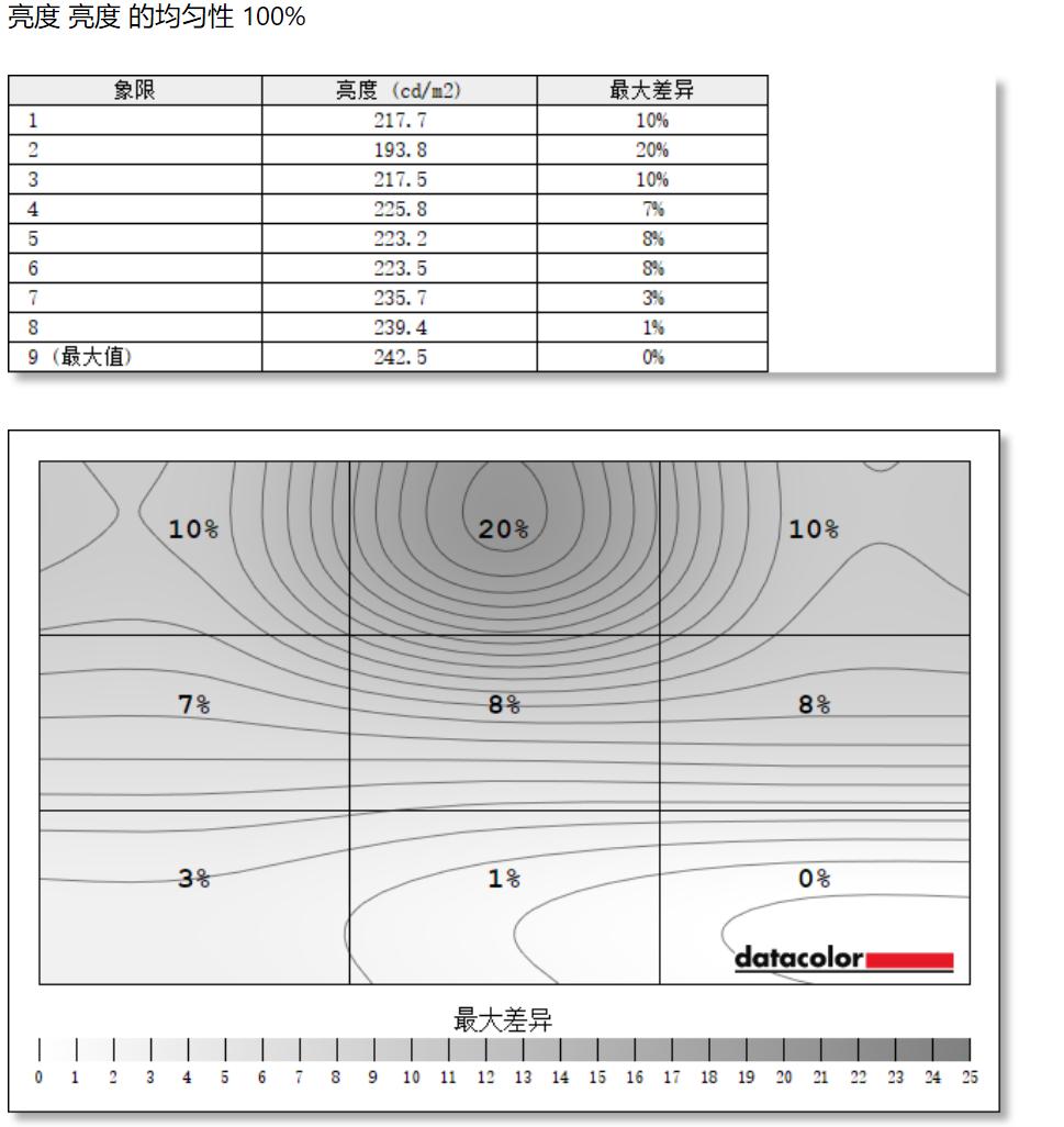 当亮度的均匀性在100%时,最大差异在0%-20%,差异最大的区域在中央上方。