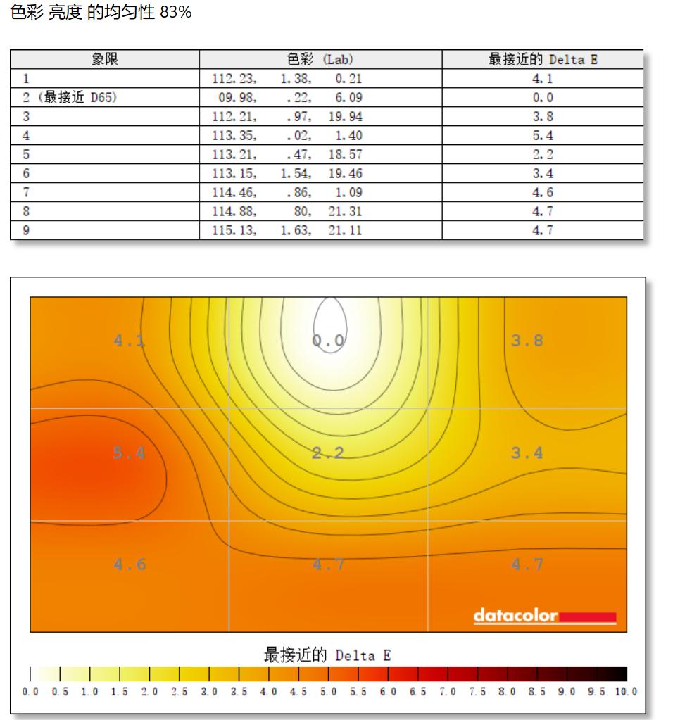 当色彩亮度均匀性在83%时,Delta E在5.4内,屏幕的中央上方区域仍旧是无偏差。