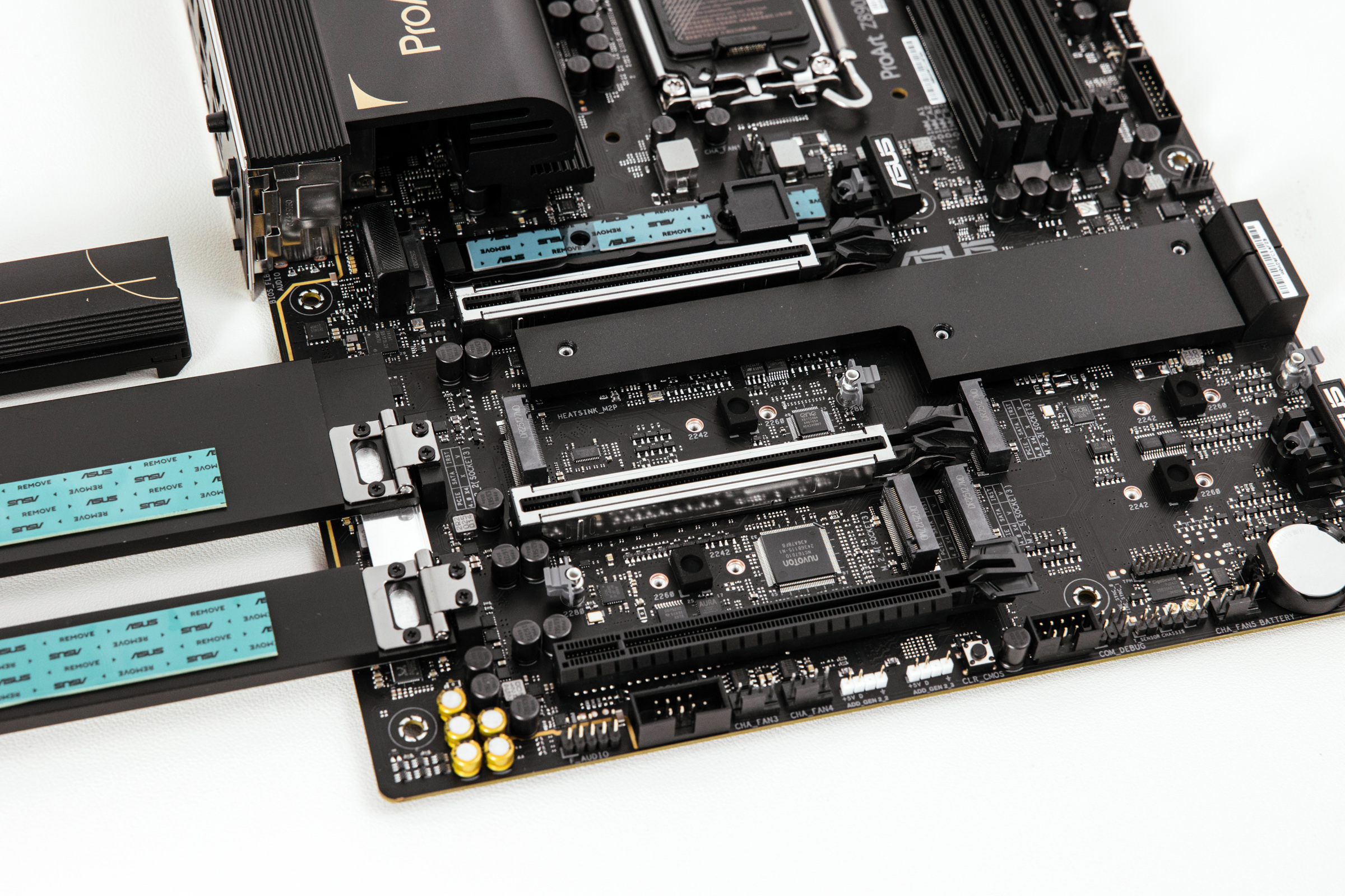 散热装甲下方是5个M.2插槽,单独散热装甲下方的为PCIe 5.0×4,大散热装甲下方四个均为PCIe 4.0×4规格,另还有四个SATA位于主板侧面。