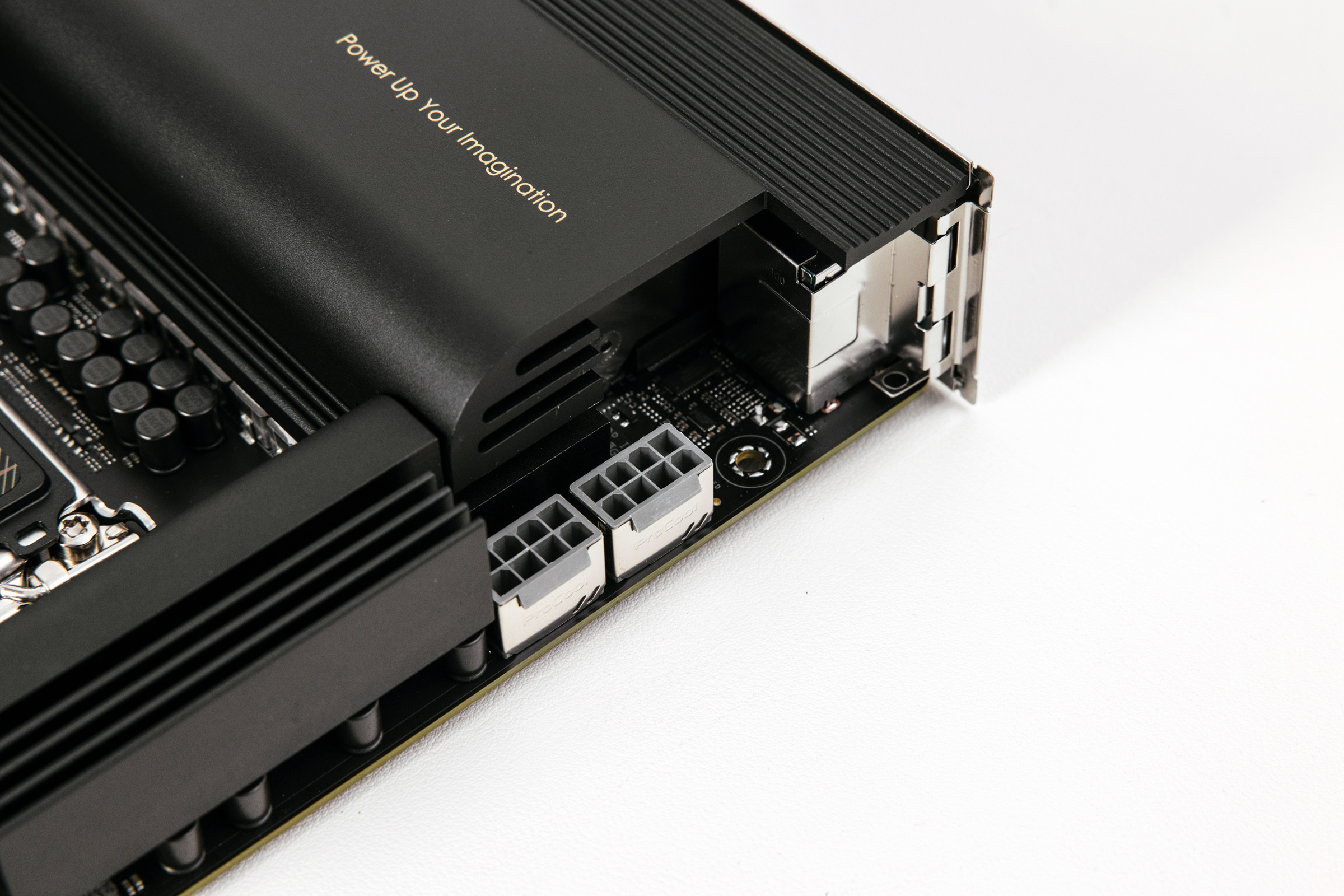 主板上方还提供了一个非常少见的DP IN接口,你可以用它来输入显卡的信号,然后通过雷电接口输出,实现雷电一线通,这个场景对于生产力来说也比较小众,但是有需要就很好用了。