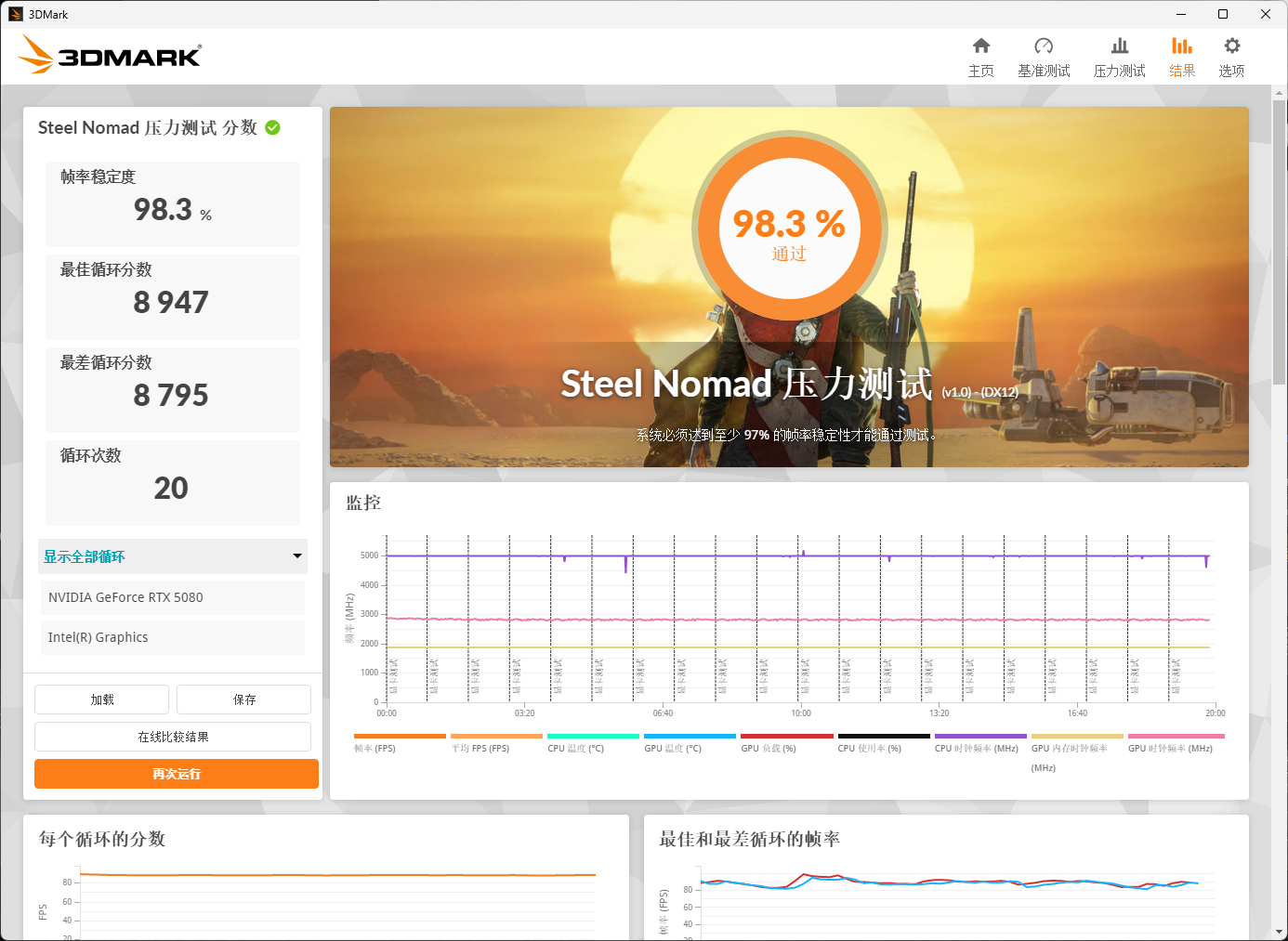 3D Mark的压力测试表现优秀,Steel Nomad压力帧率测试稳定度98.3%,Fire Strike Ultra压力测试帧率稳定度99.6%,Time Spy Extreme压力测试帧率稳定度99.1%。