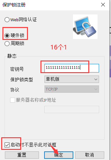 20. 选择 硬件锁,密钥号是 16个1,勾选 启动时不显示此对话框,点击 确定