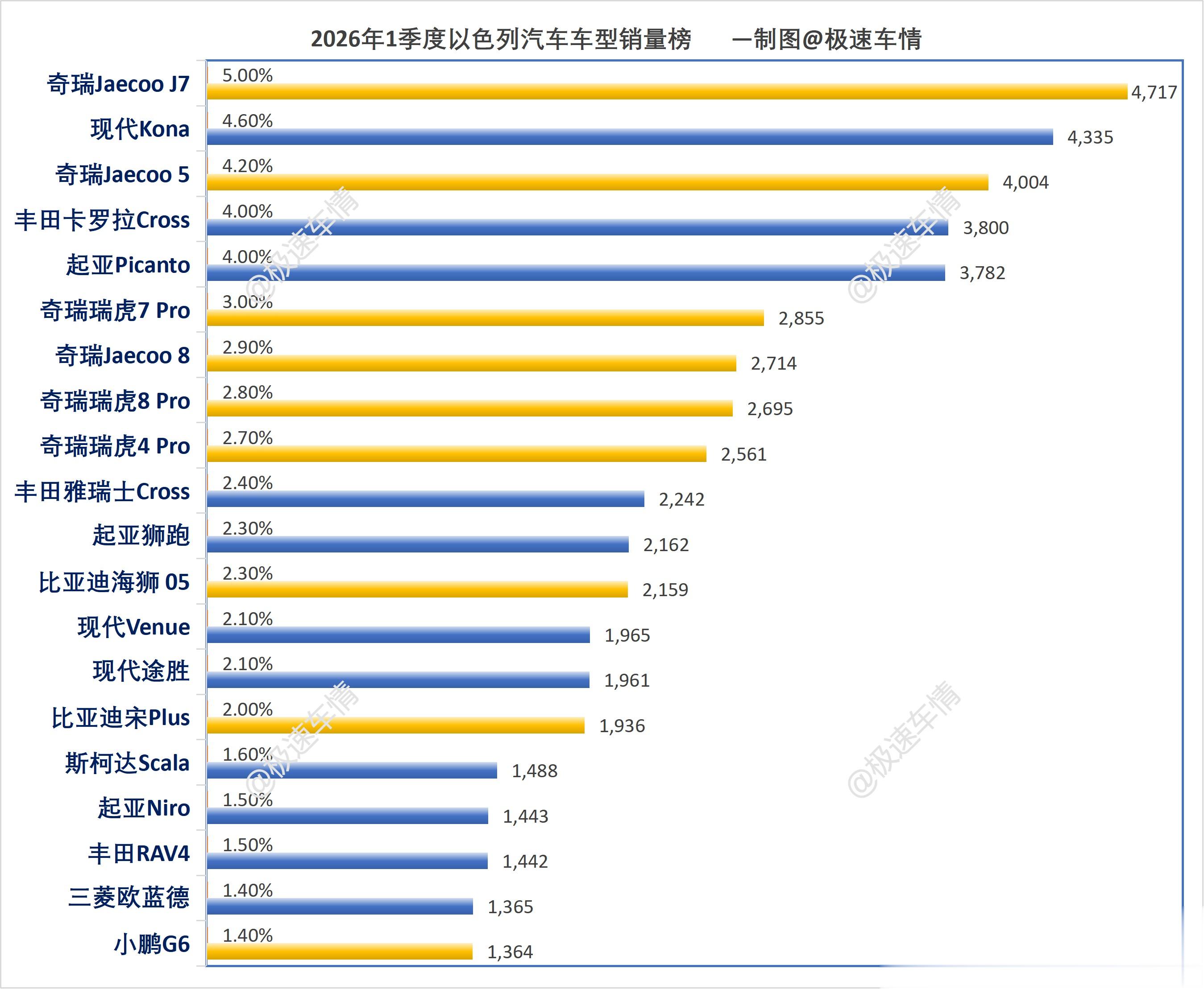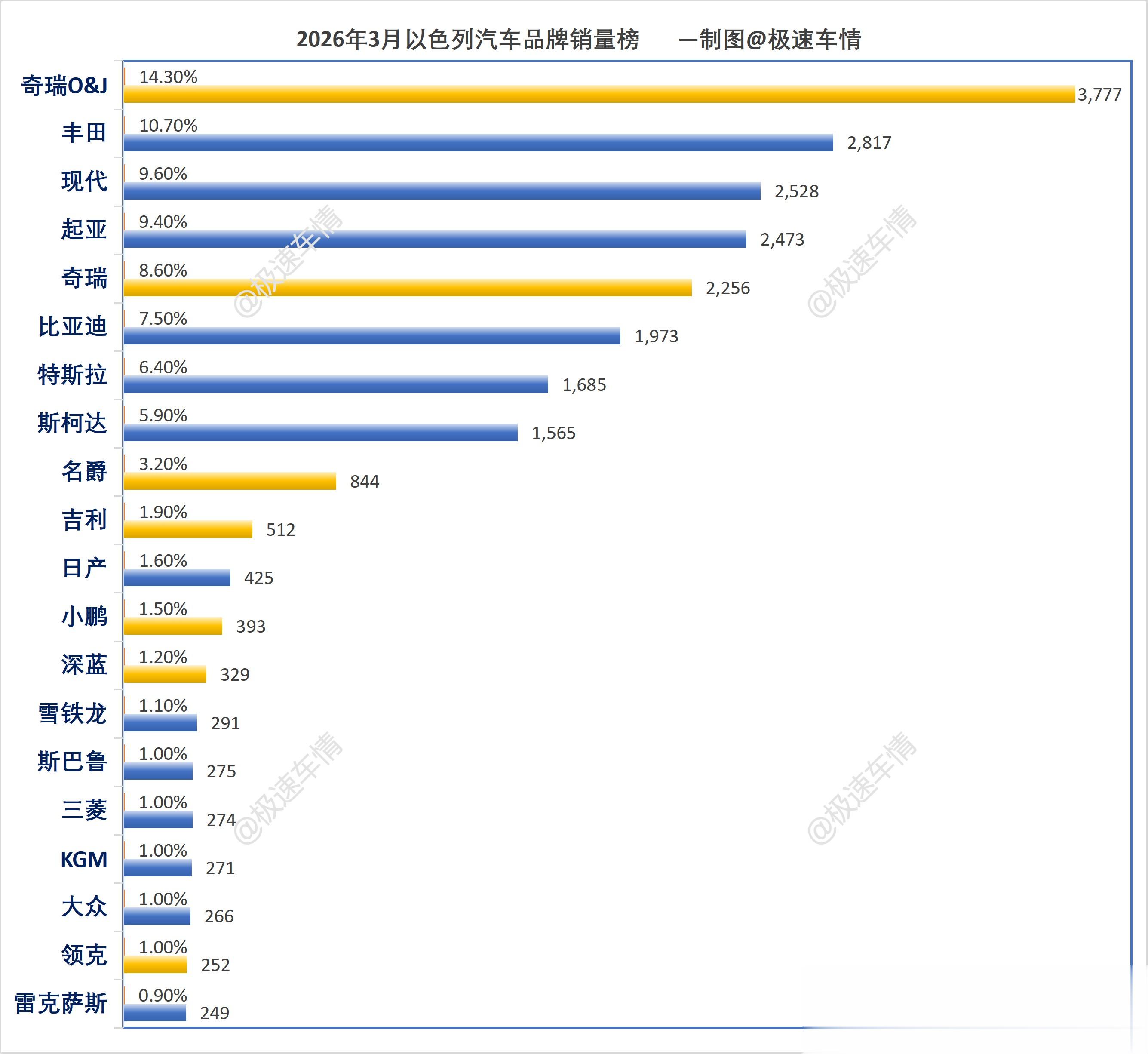 大家好,这里是极速车情。今天为大家带来以色列汽车市场2026年3月的销量数据报告。