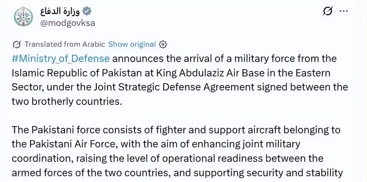 回到沙特那边发生的事情。4月11日沙特国防部发布声明,一支由战斗机和支援机组成的巴基斯坦空军部队已经进驻东部省的空军基地,声明说这是依据两国2025年9月17日签署的共同战略防御协议执行的军事行动,目的是"加强两国武装部队的作战准备水平"。措辞客客气气,分量重得惊人。