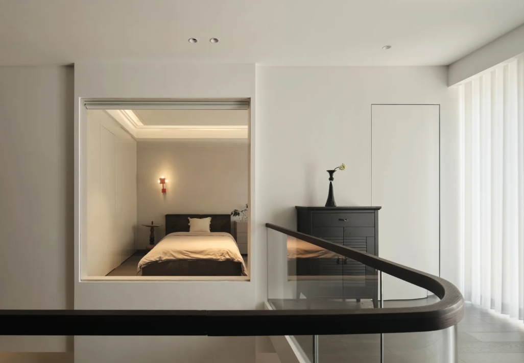 孩子房和主卧两间房间没有建在一起,遇到好天气时,可以将孩子房的窗帘全部打开,卧室和中庭空间就会连在一起,给人一种从未想象过的新鲜感。室内窗并不算非常特别的设计方式,但外窗框用「拍立得相纸」的造型,和挑空联系在一起,会令我们留意到日常生活中不曾在意到的小欣喜。