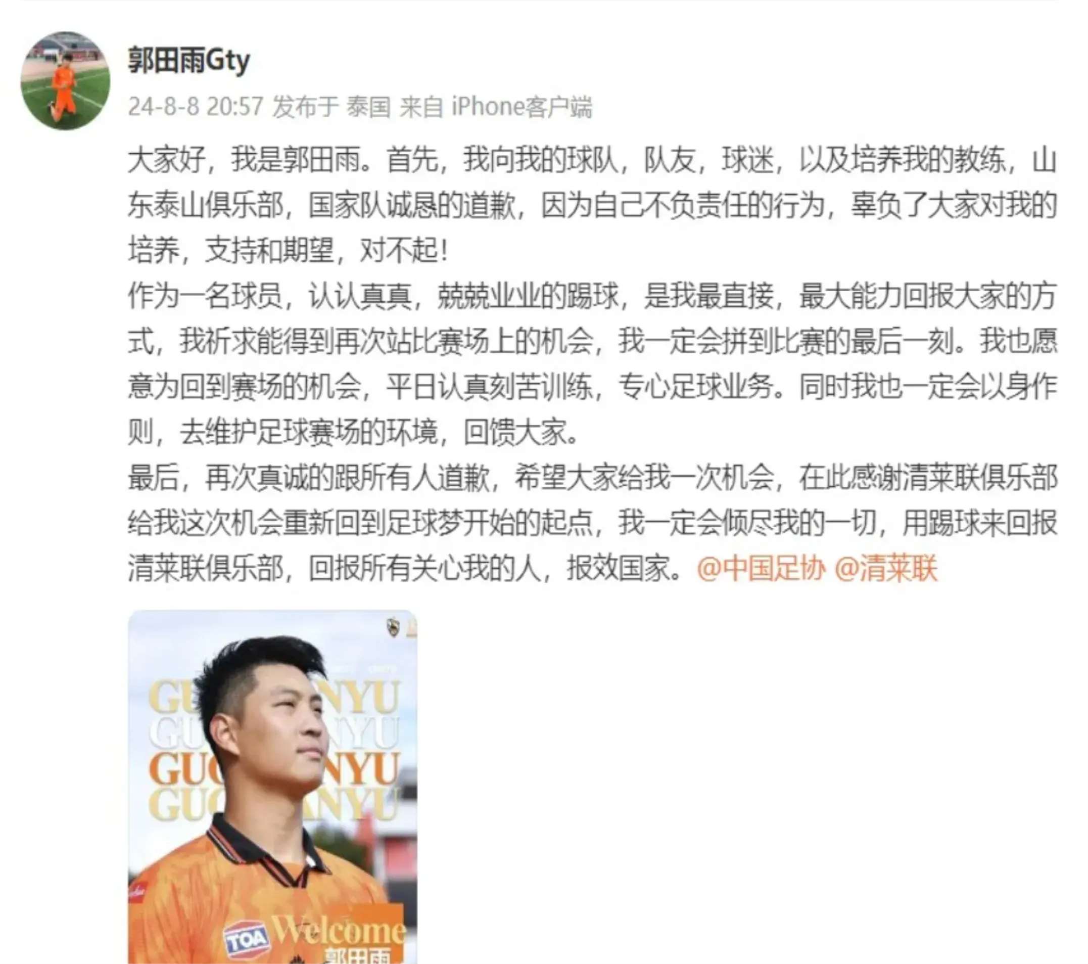 值得一提的是,在清莱联俱乐部公告后不久,郭田雨本人也通过微博发文向国内的教练、球队和球迷致歉。他表示:“过去的几个月对我来说是一段艰难的时光,我深感抱歉给关心我的人带来了困扰。感谢清莱联俱乐部给我这次机会,我会努力踢球,用实际行动回报大家的信任。”