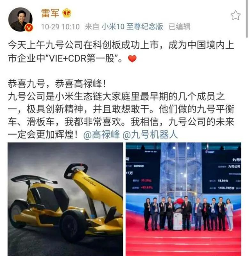 2020年10月29日,九号公司成功在科创板上市,成为国内“VIE + CDR第一股”。与其他上市公司创始人登台鸣锣不同,九号选择让一台机器人上台敲锣。高禄峰希望通过这一举措,让外界了解九号未来的目标和企业驱动力——机器人是九号未来的野心所在。