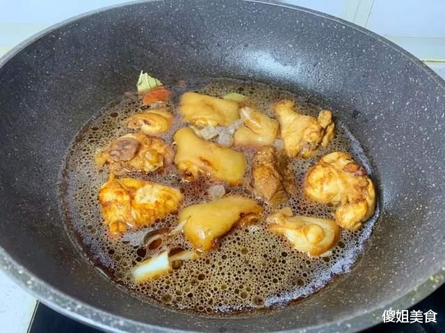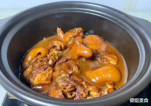 时间一到,打开锅盖,那香味扑鼻而来,锅里的猪蹄已经炖得红亮软糯,用筷子轻轻一戳就能戳透,鸡腿肉也吸饱了汤汁,看起来特别诱人。