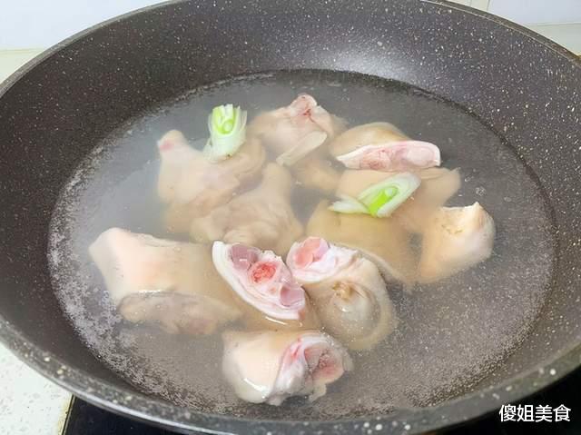 2、把猪蹄块和鸡腿块冷水下锅,放入几片生姜,倒点料酒,开大火煮开,这时候会浮起来很多血沫,用勺子把这些沫子撇干净。焯水不仅能去除腥味,还能让做出来的猪蹄更加干净清爽。焯好之后捞出来,用温水冲洗干净,沥干水分备用。