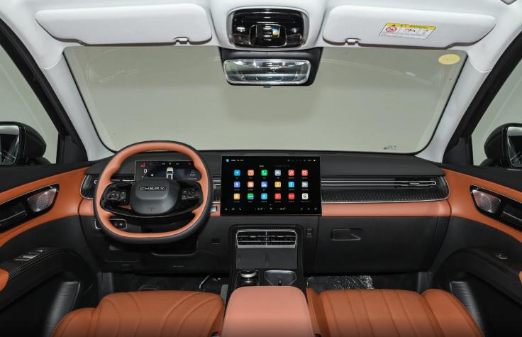 目光切换到座舱内部,全新奇瑞瑞虎8提供了两种时髦的配色,分别对应墨竹黑和琥珀棕。前排中控台采用环抱式布局,主驾驶前方为10.25英寸组合仪表,适配全新样式的电动换挡杆和双幅式多功能方向盘,营造出整洁大方的座舱科技感。重点聚焦在中控屏区域,虎款采用15.6英寸悬浮式中控屏,下方采用双手机放置平台,保留单无线充电面板设计,是比较主流的设计方案。而豹款则采用了非常规的13.2英寸一体式纵置中控屏,保留了部分的实体空调控制按键和单手机无线充电面板。