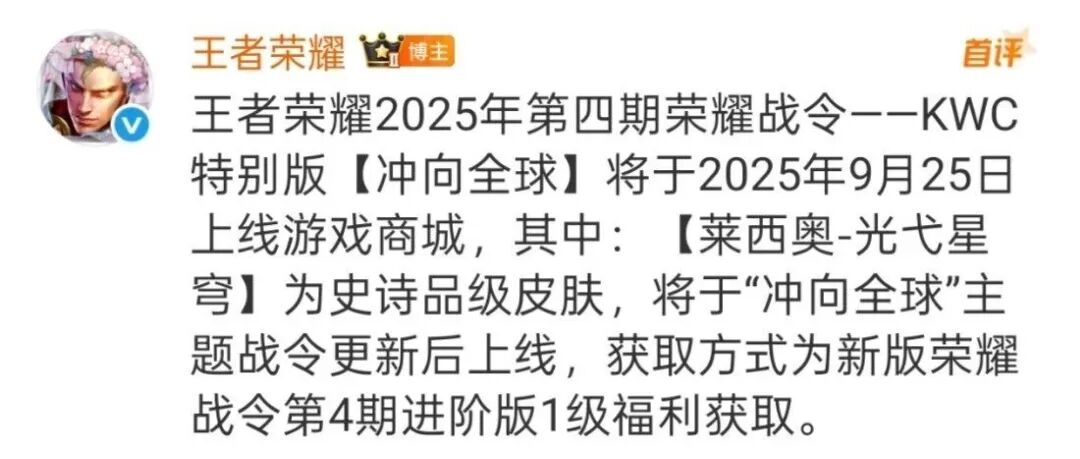 这款皮肤的品质是史诗,为王者荣耀2025年第四期KWC特别版战令皮肤,进阶后1级获取。上线时间就是正式服更新的时间,也就是9月25日。