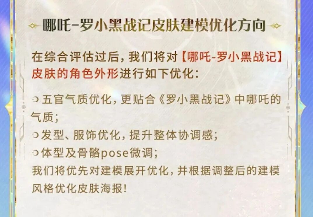 另外,基于玩家们对于罗小黑战令皮肤吐槽的情况,王者荣耀决定针对已经上线的哪吒的罗小黑战记皮肤进行优化。主要是为了更贴合罗小黑战记中的哪吒形象和气质。那么,拭目以待。