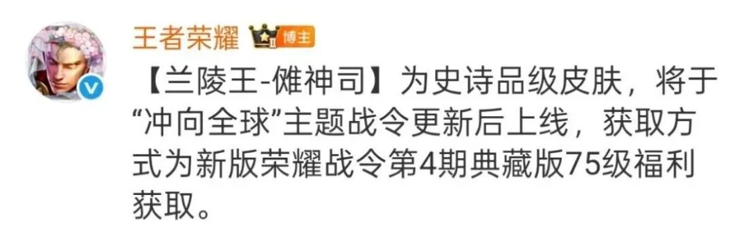 兰陵王这款战令皮肤,为史诗品质,需要选择典藏版进阶才能在75级的时候拿到这款皮肤,算是典藏版战令独享的皮肤。
