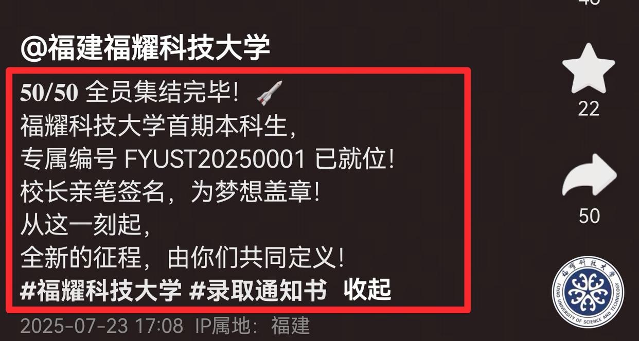 7月23日,福耀科大在官网发布消息,称50份录取通知书已经制作完成,由王树国校长亲笔签名,全新的征程已经开启。