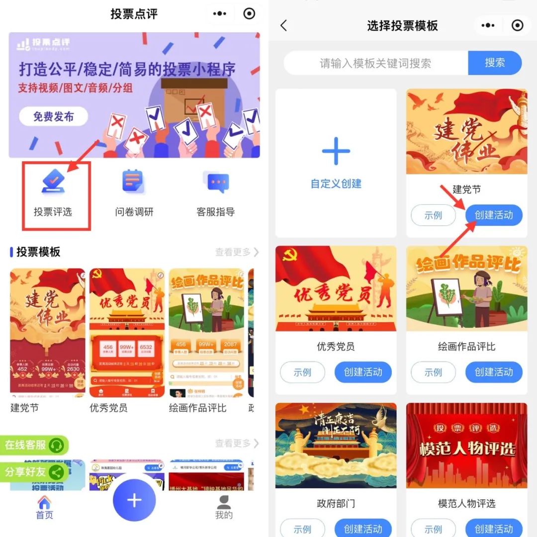 ✅进入小程序首页,找到并点击“投票评选”或选择模版创建