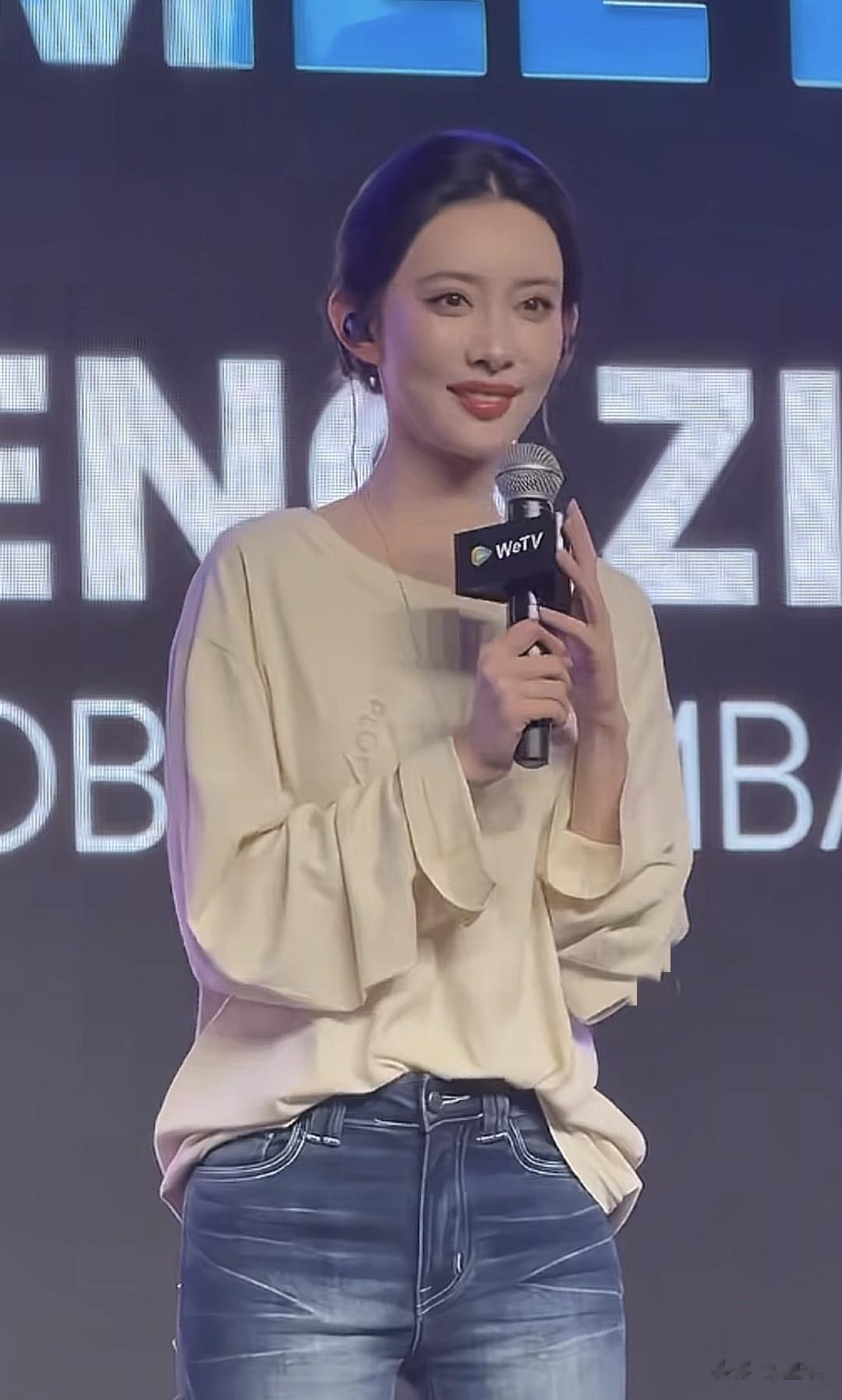 孟子义在活动场合,她身着简约上衣搭配牛仔裤,手持话筒站在舞台,状态自信大方。
