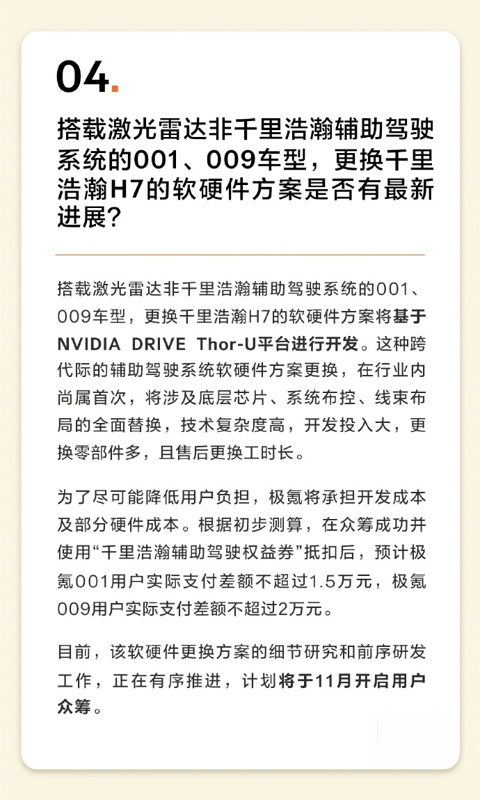 而且极氪这次要解决的不是简单的小升级,而是跨平台更换整套辅助驾驶系统,听着就知道要花不少钱、费不少劲。对于没激光雷达、没法硬件升级的车型,老车主也能拿到一张5年有效期的权益券,换新车能抵2万。
