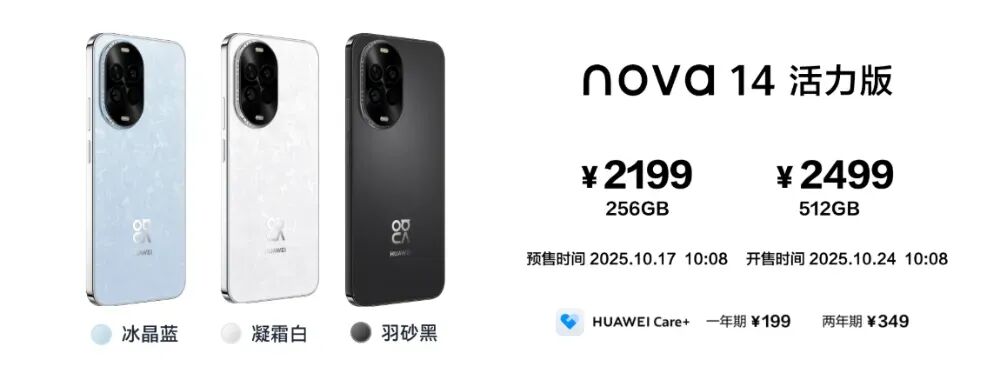 定价方面,华为nova 14 活力版,256GB版本 2199 元、512GB版本 2499 元。
