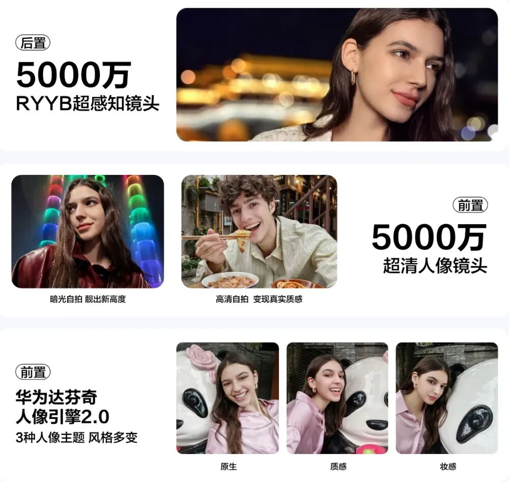 影像部分,前置 3200万像素摄像头,后置5000万像素摄像头、800万像素超广角摄像头组合,结合华为达芬奇人像引擎 2.0。