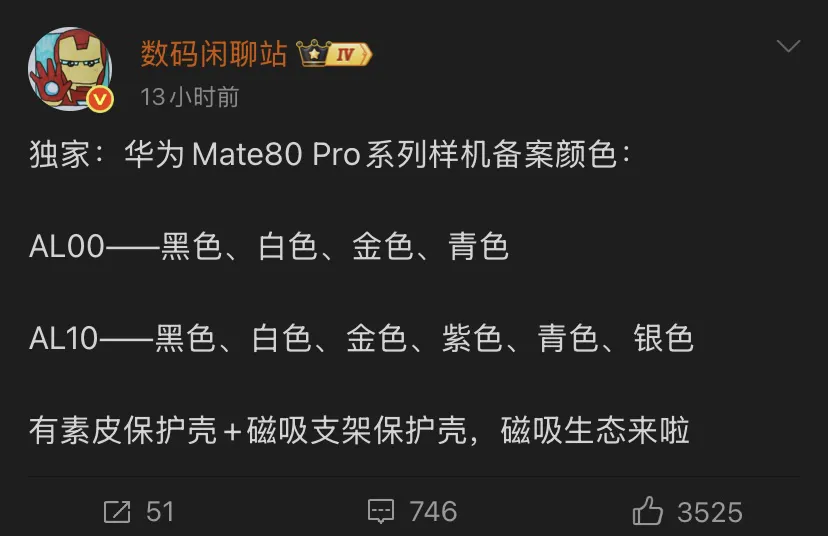 Mate 80 Pro(型号AL00)将推出黑、白、金、青四款配色,质感臻至巅峰。而Mate 80 Pro+(型号AL10)则拥有六款动态色彩,包括:· 黑色· 白色· 金色· 紫色· 青色· 银色黑白双色仍是华为旗舰的经典选择,但Mate 80系列新增了金色与青色。此外,Pro+版本可能延续去年首度亮相的闪银色与紫色设计。目前标准版与Mate 80 非凡大师设计的配色尚未明确。标准版或部分延续Pro版本风格,而Mate 80 非凡大师则可能如前辈一样,推出黑、红及一款新色调。