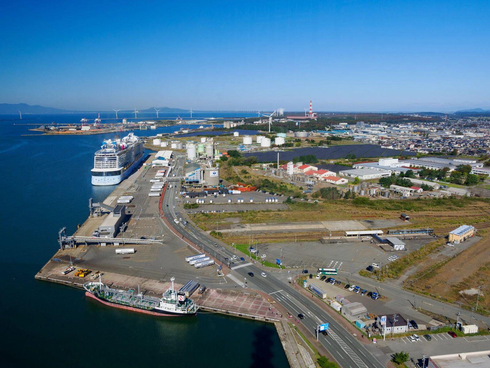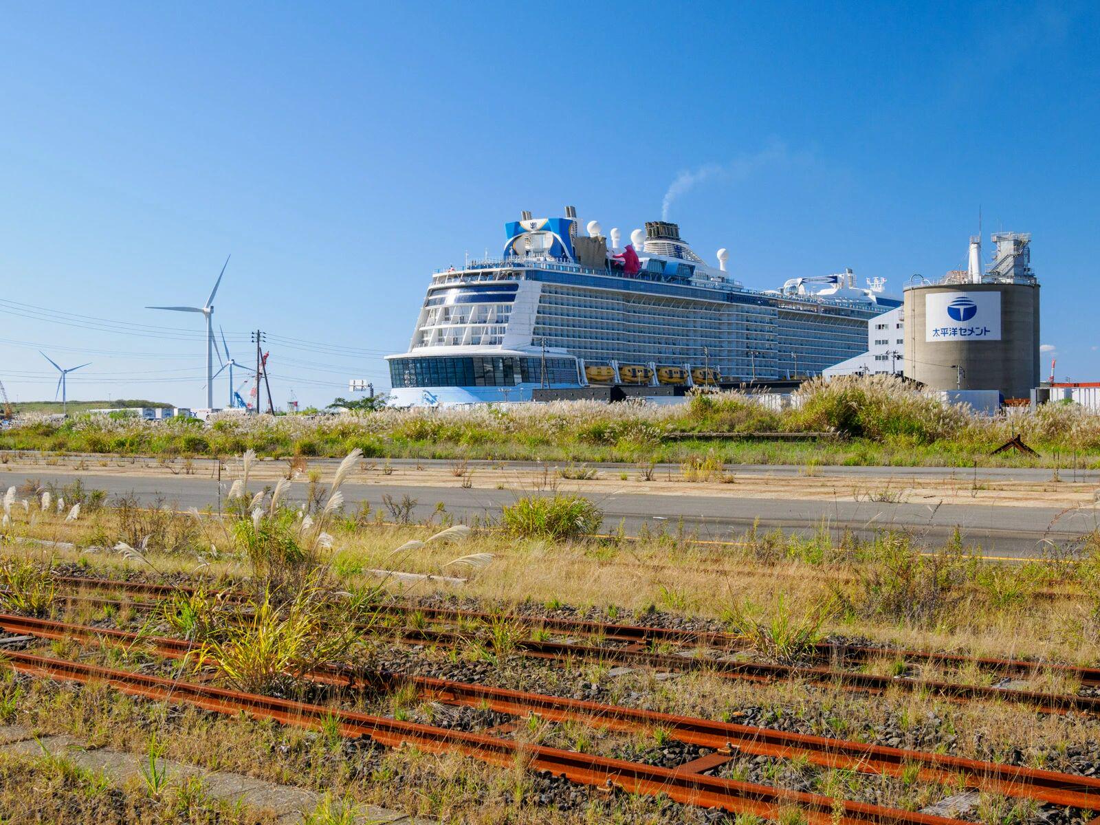 远处看到的是男鹿半岛。 秋田港有风力发电所、工厂、集装箱码头、客船码头等各种设施,让人百看不厌。 尽管如此,游轮还是很大……